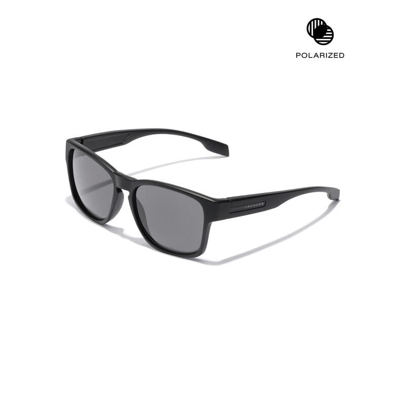 Het matzwarte montuur vooraan heeft klassieke, rechthoekige randen met geïntegreerde neuskussentjes en donkere, gepolariseerde glazen.